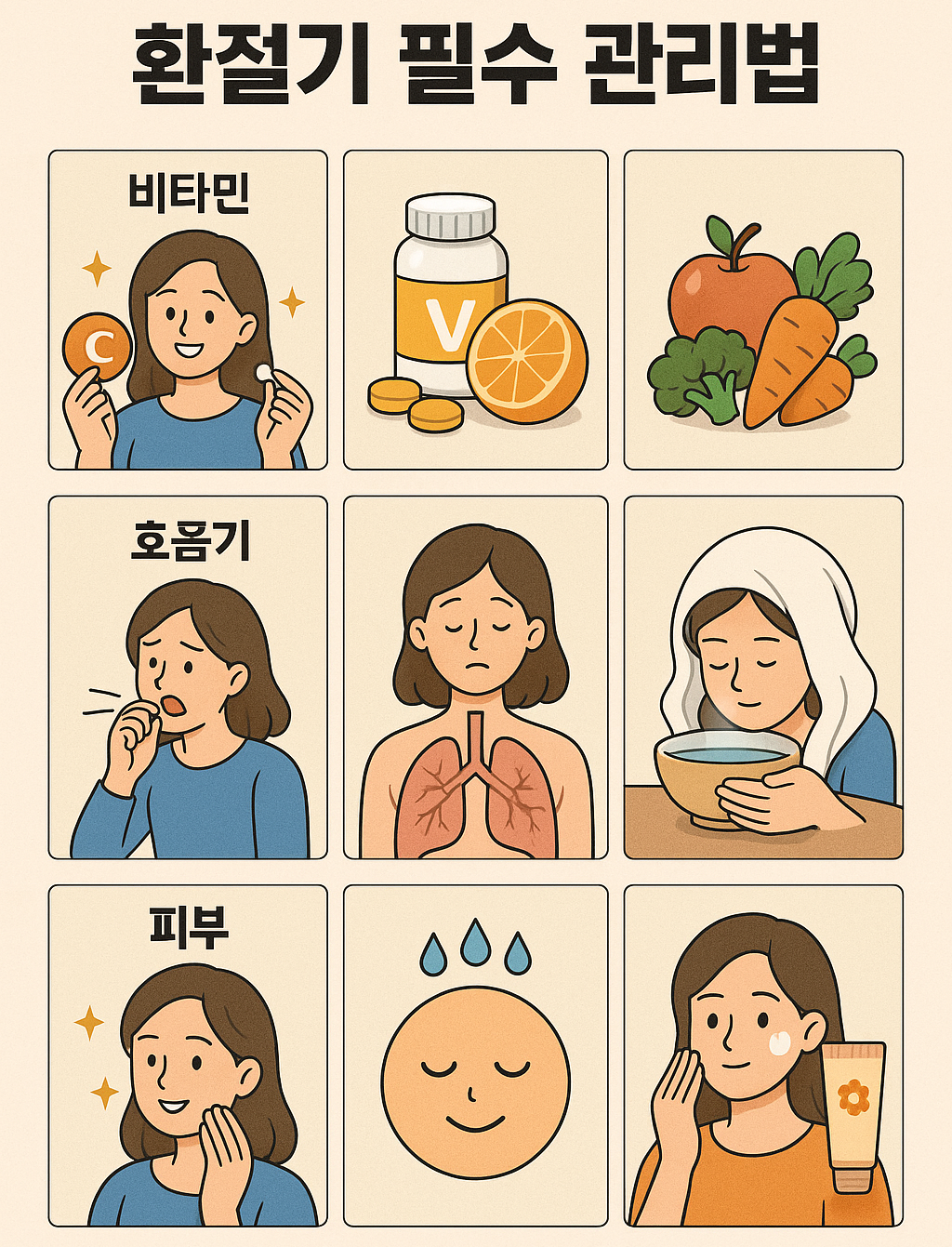 여름에서 가을로 넘어가는 환절기는 체온 변화와 건조한 공기, 면역력 저하로 인해 건강에 특별한 주의가 필요한 시기입니다. 이 글에서는 환절기 건강관리를 위해 꼭 챙겨야 할 비타민 섭취, 호흡기 질환 예방, 피부 관리 방법을 구체적으로 살펴보며, 일상 속에서 실천할 수 있는 건강 관리 팁을 정리했습니다.