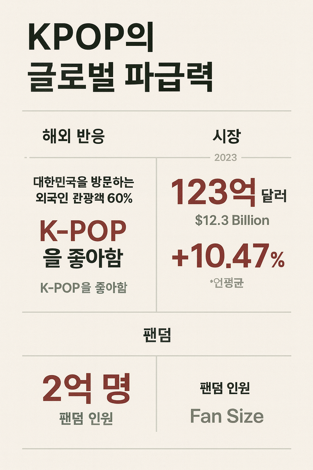 Kpop은 이제 단순한 음악 장르를 넘어 글로벌 문화 콘텐츠로 확고히 자리 잡았습니다. 아시아를 넘어 북미, 유럽, 중동, 아프리카까지 그 영향력을 확대해 나가고 있으며, 음악 산업뿐 아니라 패션, 뷰티, 광고, 관광 등 다양한 분야에 파급력을 미치고 있습니다. 이 글에서는 Kpop이 전 세계에서 어떻게 반응을 얻고 있으며, 어떤 시장 구조로 성장하고 있고, 팬덤은 어떤 방식으로 형성되어 있는지를 자세히 살펴보겠습니다.